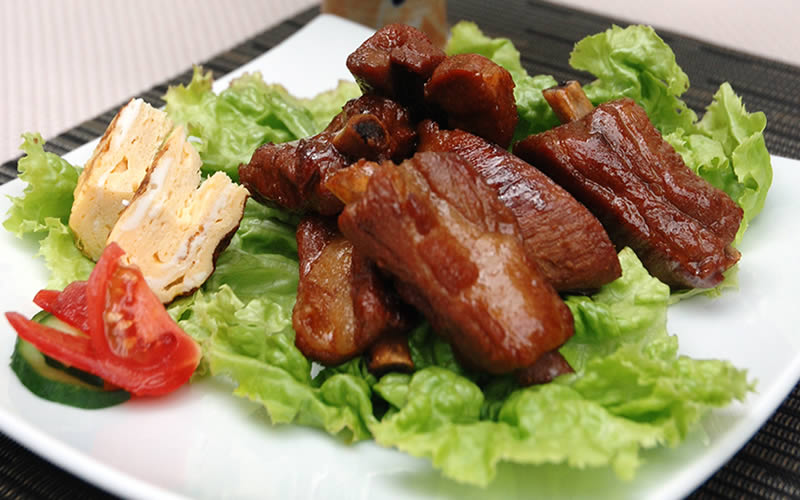 Yakibuta (Schweinfleisch, gerollt, angebraten und in Sojasauce gekocht)